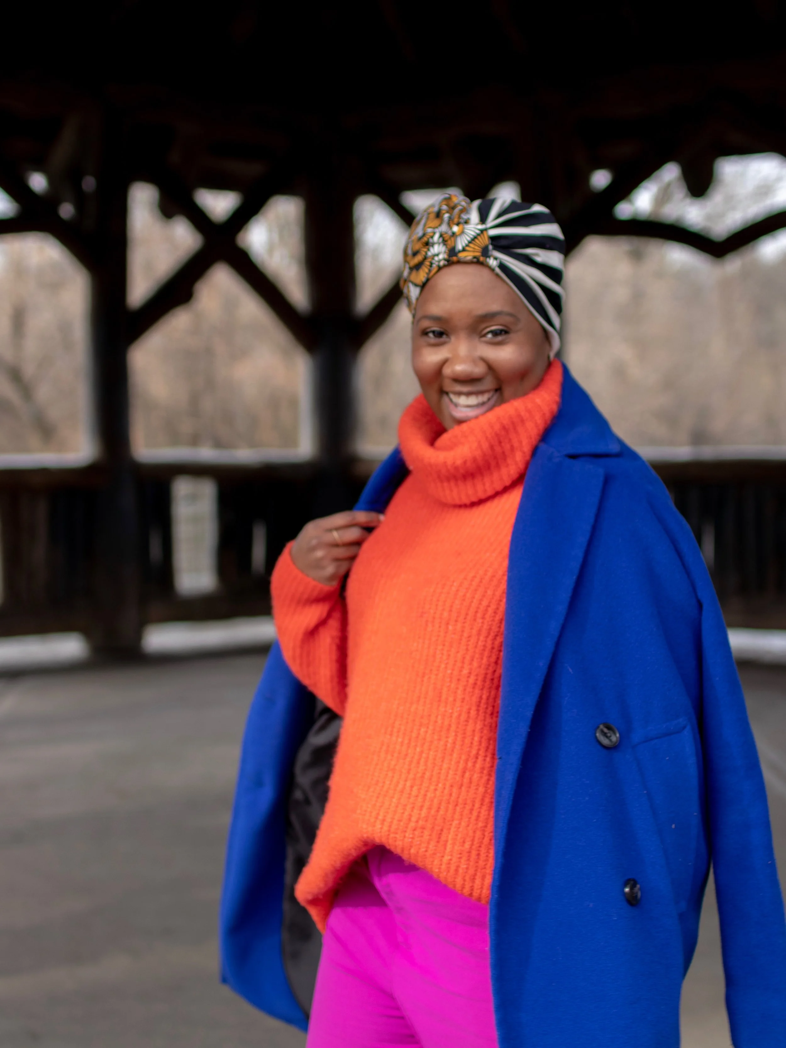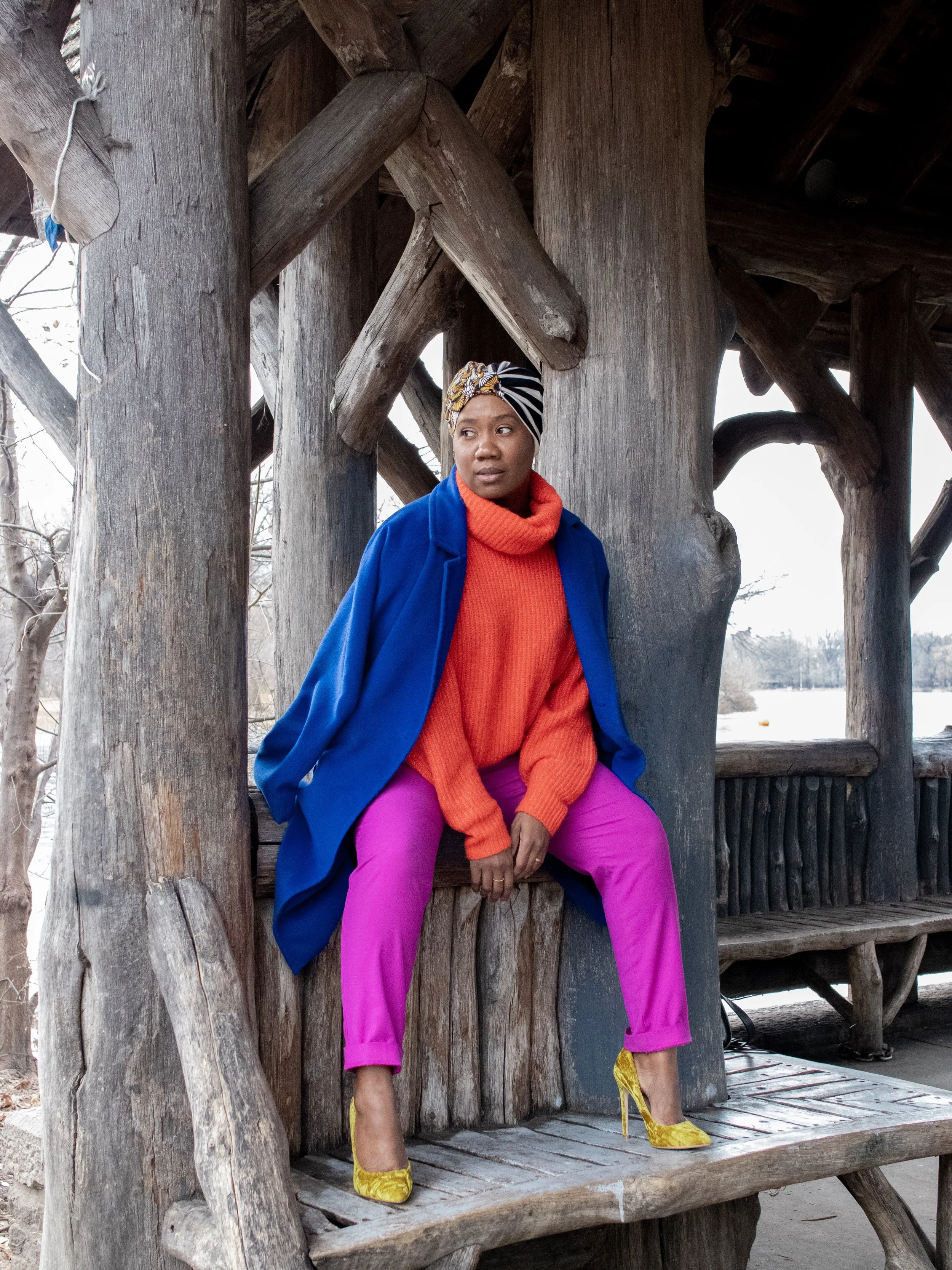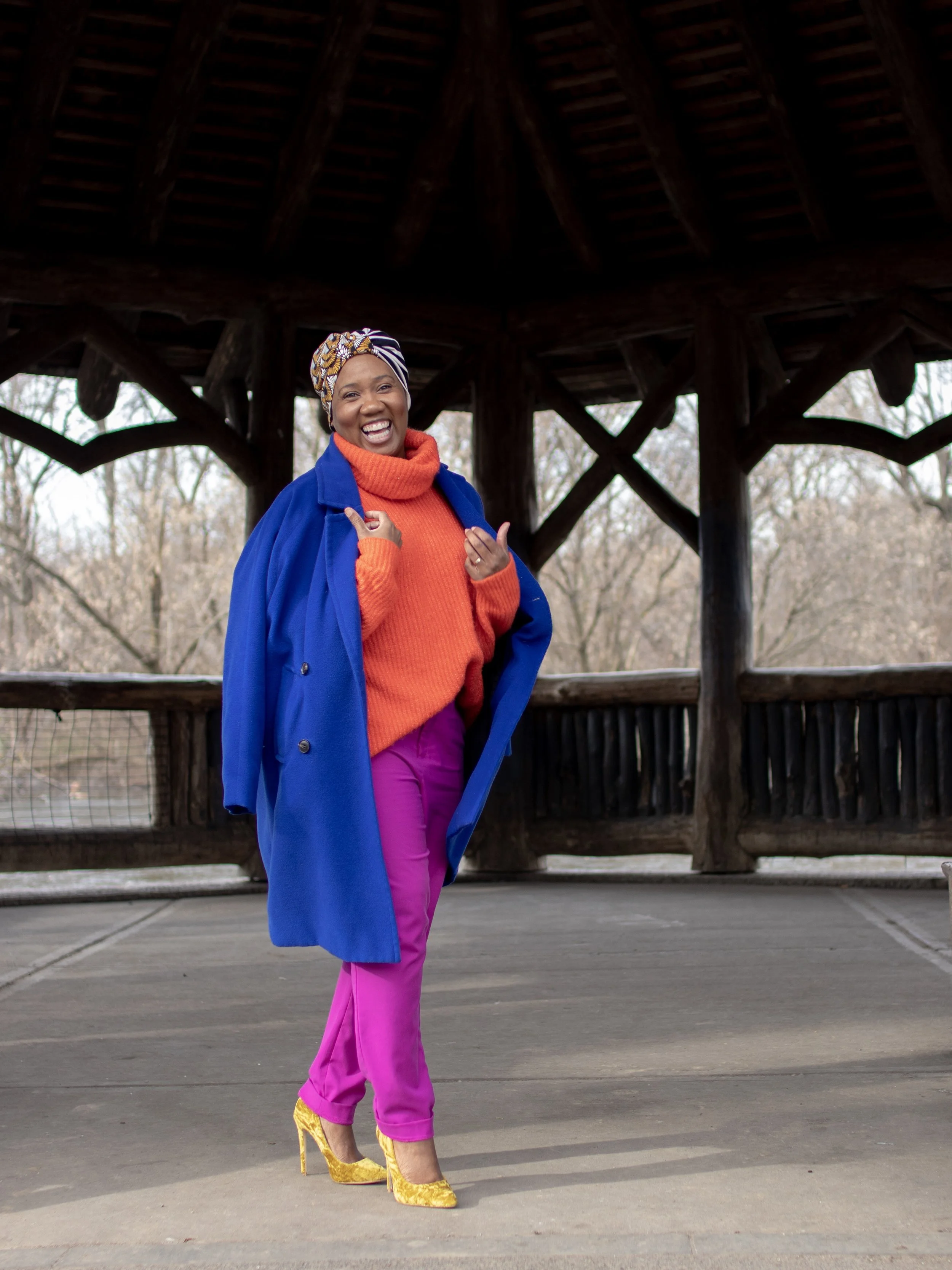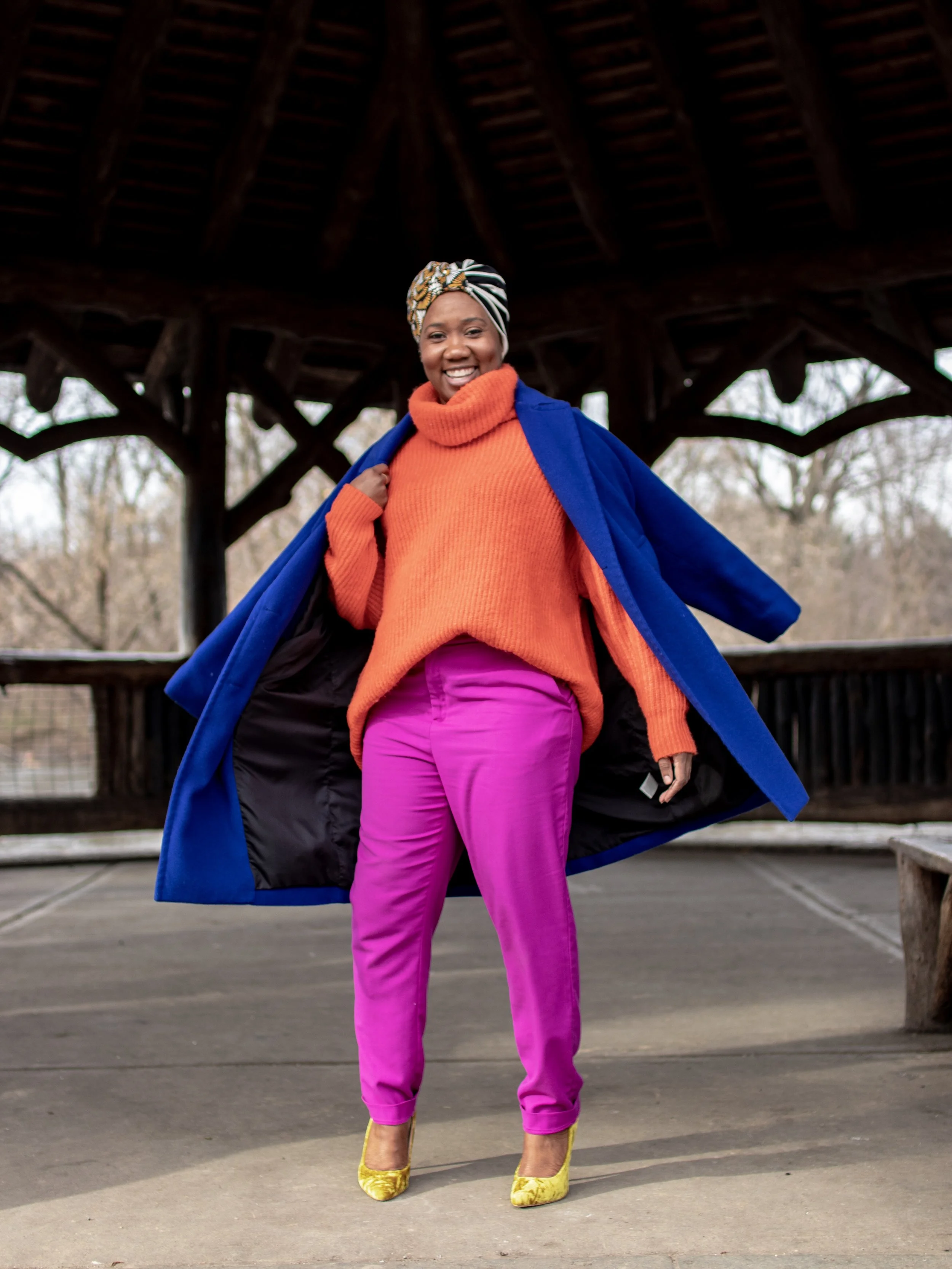 2. Wear bold colored outerwear. The great thing about coats (in most cases, but you know I’m extra) is that you don’t have to worry about putting a whole outfit together to match your coat. If you’re *not* like me, and actually plan on CLOSING your coat, then it doesn’t matter what colors you’re wearing underneath, because your outwear will do all the talking. This cobalt blue coat from J.O.A. (a brand I also carry in my shop) is a showstopper!