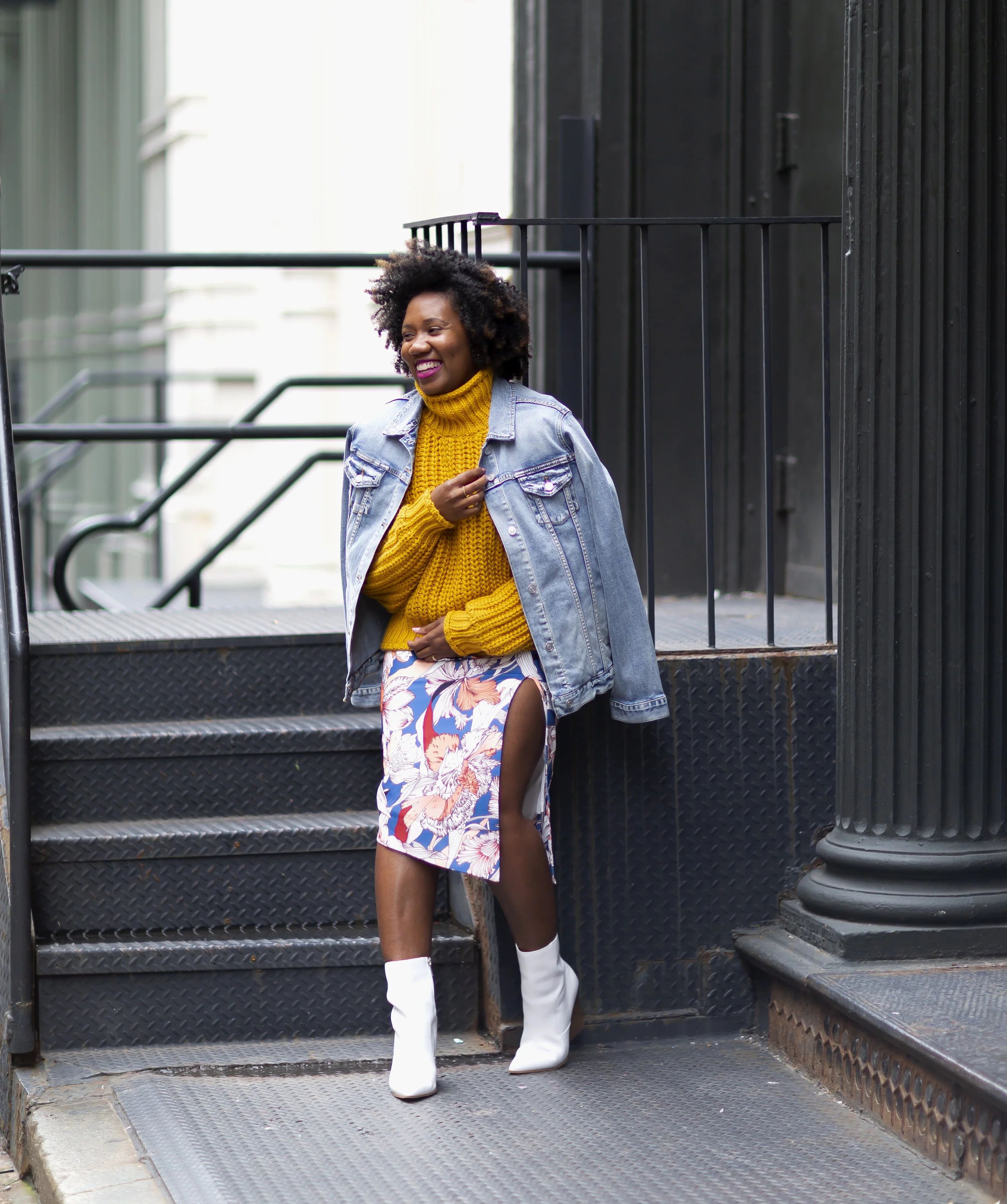 I wore this classic turtleneck in a vibrant marigold, over a dress to winterize one of my favorite summer pieces. This dress is sleeveless with a low v-neck (definitely not suitable for Fall/Winter in NYC), so adding a sweater and denim jacket made it easy to wear as the temps got cooler.