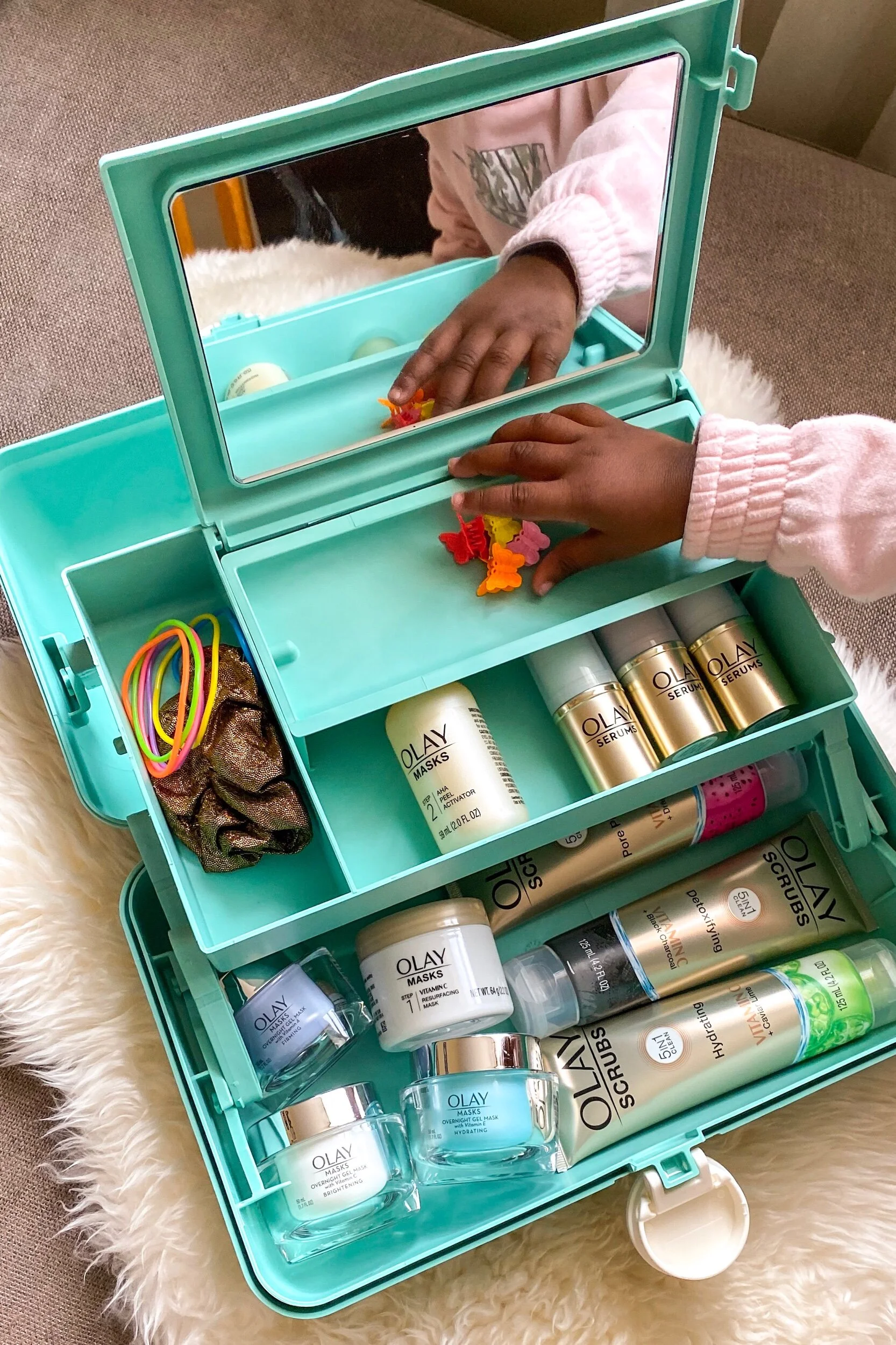 How cool is this Kaboodle Olay sent over with some classic 80s accessories? Elle LOVED the tiny butterfly clips and couldn’t keep her little hands off of them.